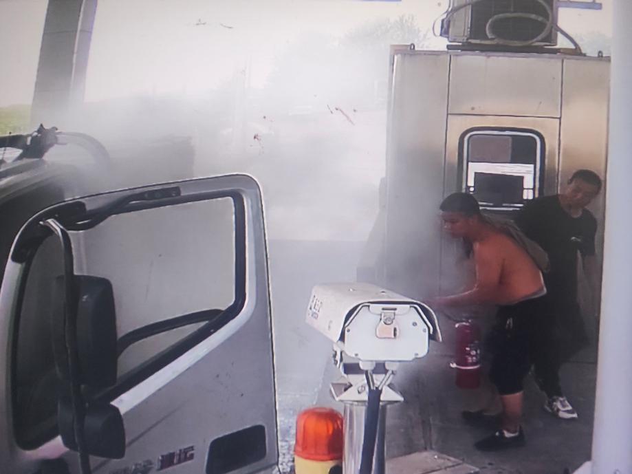 9月4日14時51分,一輛牌照為皖L39FC5的物流貨車途經(jīng)S202淮北收費站正在繳費時,當(dāng)班收費員縱方珠發(fā)現(xiàn)車廂內(nèi)冒出煙霧,判斷是車上貨物發(fā)生自燃,現(xiàn)場十分危急,在立即通知了收費班長之后,迅速從崗?fù)つ贸鰷缁鹌髋浜纤境苏归_滅火救助。當(dāng)班班長盛勇、副班長孫克即刻組織人員把車推出車道并進(jìn)行交通指揮,以保障其余車輛的安全暢通。由于發(fā)現(xiàn)撲救及時,在不到1分鐘的時間內(nèi)撲滅了火源,最大程度減少了貨物財產(chǎn)的損失,保障了司乘人員及車輛的安全,從而遏制了安全事故的發(fā)生。