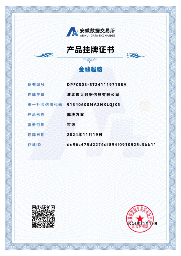 自2024年9月20日安徽省數(shù)據(jù)交易所揭牌成立以來,淮北市大數(shù)據(jù)信息有限公司積極和省數(shù)交所對接,分析調(diào)研數(shù)據(jù)要素流通市場,交流探討數(shù)商合作生態(tài),研究探索數(shù)字產(chǎn)品掛牌交易。近期,我司金融信貸服務解決方案方向的數(shù)據(jù)產(chǎn)品“金融超腦”在交易所成功掛牌,實現(xiàn)了公司乃至淮北市數(shù)據(jù)產(chǎn)品在省數(shù)據(jù)交易所零的突破。為推進我市數(shù)據(jù)要素市場化改革、助力經(jīng)濟社會高質量發(fā)展、發(fā)揮數(shù)據(jù)乘數(shù)效應增磚添瓦。