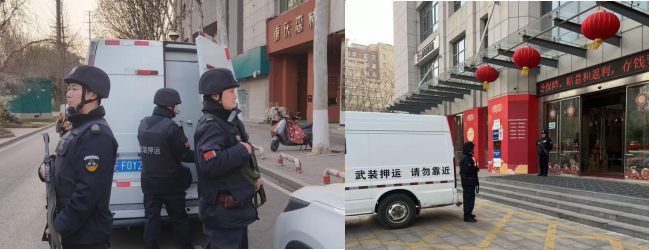 春節(jié)期間,押運車組每日準(zhǔn)時出車,穿梭于城市街巷,安全準(zhǔn)點完成各金融網(wǎng)點款箱接送任務(wù);人防保安員同步跟進,駐守網(wǎng)點門前、巡查自助區(qū)域,細致排查每一處安全隱患。從押運線上的風(fēng)雨兼程到網(wǎng)點門前的日夜守護,他們用默默堅守,守護著這座城市的平安與安寧。