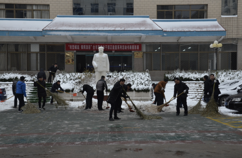 在紀(jì)委書記王獻忠、總經(jīng)理助理朱濤的帶領(lǐng)下,廣大干部職工紛紛拿起鐵鍬、掃帚等工具,不畏嚴(yán)寒,你鏟我掃,相互配合,一點點地將積雪和冰層鏟起清除。盡管大家的臉都凍得通紅通紅,但手中的掃雪工具卻不停地揮舞著,忙得渾身是汗,在歡聲笑語中掃出了暢通的大道,受到過往市民的紛紛稱贊。