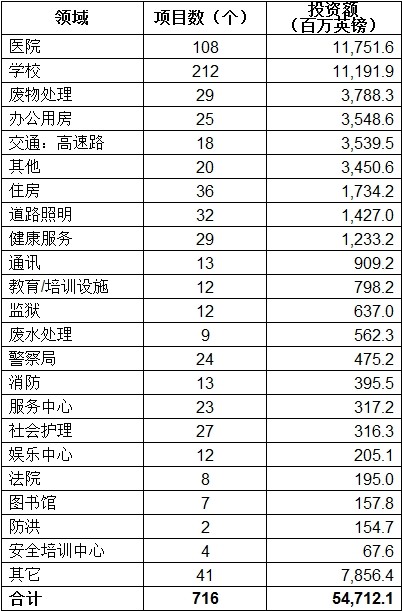 截至2012年3月,在PFI下共有717個項目,總投資547億英鎊。其中,648個處于運行階段。具體情況見附表。