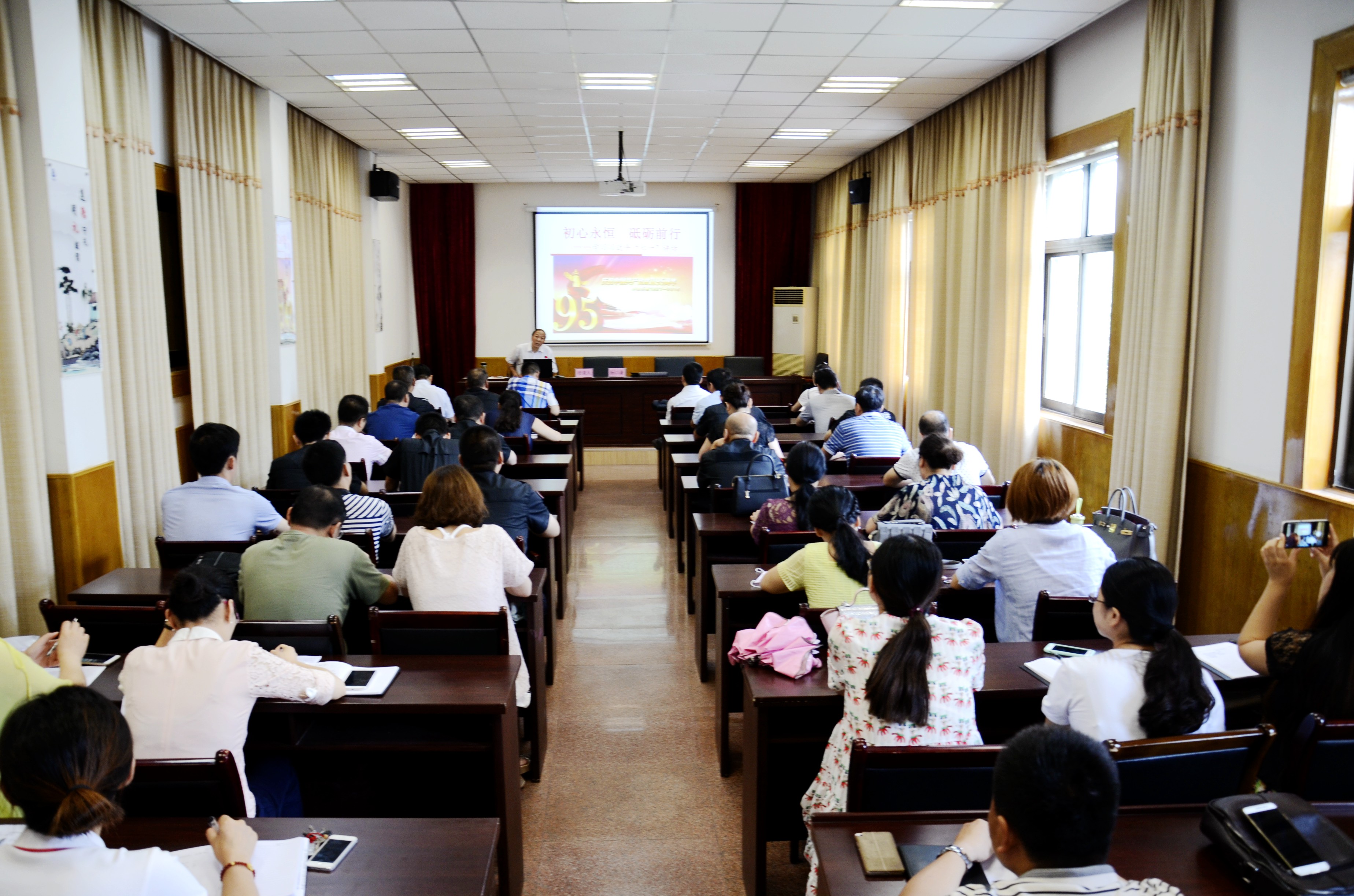 講座邀請市學(xué)習(xí)習(xí)近平總書記“七一” 重要講話精神宣講團(tuán)成員、市委黨校副校長、市委黨校教授、市政協(xié)常委楊以謙教授作了題為《初心永恒 砥礪前行——學(xué)習(xí)習(xí)近平“七一”講話》的講座。楊以謙教授從學(xué)習(xí)習(xí)近平“七一”講話“不忘初心”為切入點,以理論和實際相結(jié)合的科學(xué)方法,運用豐富的黨史資料,通過詳實的事例、透徹的說理、生動的表述,深入淺出地闡述了對中國共產(chǎn)黨對中國乃至全世界所作出的杰出貢獻(xiàn),并聯(lián)系淮北實際強調(diào)了“兩學(xué)一做”的重要性。